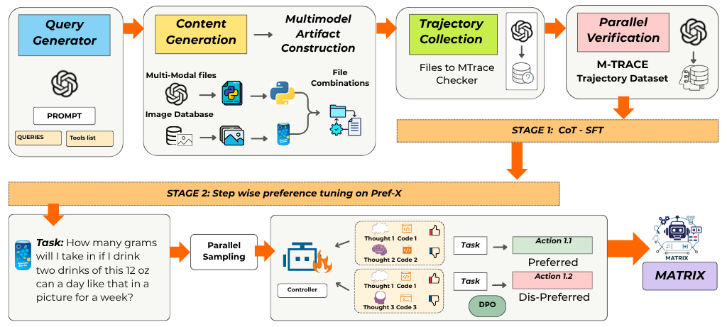 To address this, we introduce a two-stage training framework that combines trajectory supervision with preference optimization. In the first stage, Supervised Fine-Tuning (SFT) on automatically synthesized multimodal trajectories from M-TRACE equips the controller with structured tool-use and reasoning skills. In the second stage, preference optimization via Direct Preference Optimization (DPO) (Kong et al., 2025) on step-level exploration data (Pref-X) further refines decision-making beyond imitation, encouraging the agent to select accurate, consistent, and goal-directed actions.
