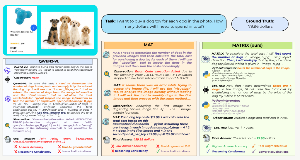Evaluated on Agent-X, GTA, and GAIA, MATRIX outperforms both open and closed-source VLMs, improving accuracy by up to 23% and setting a new benchmark for robust multimodal tool-use reasoning.